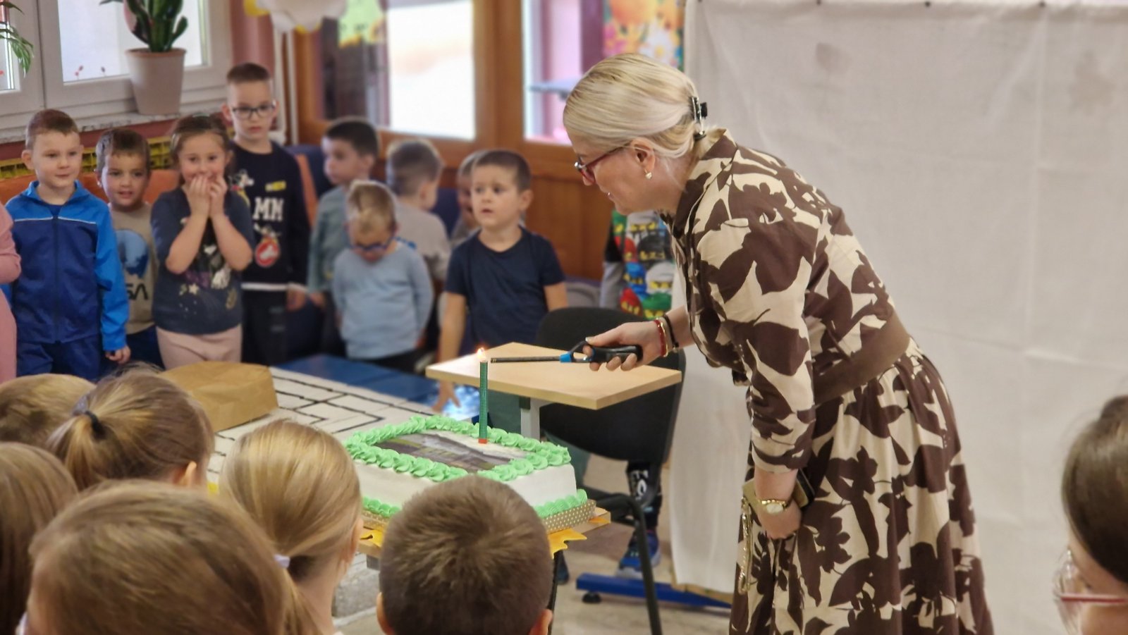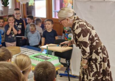 Za ovu posebnu proslavu napravljena je i velika, prekrasna torta s slikom izgleda naše škole, koja je oduševila sve prisutne. Učenici, učitelji i gosti zajedno su uživali u ovoj slatkoj poslastici, čime je dan završio u pravom svečanom tonu – uz osmijehe, zajedništvo i ponos na našu školu.