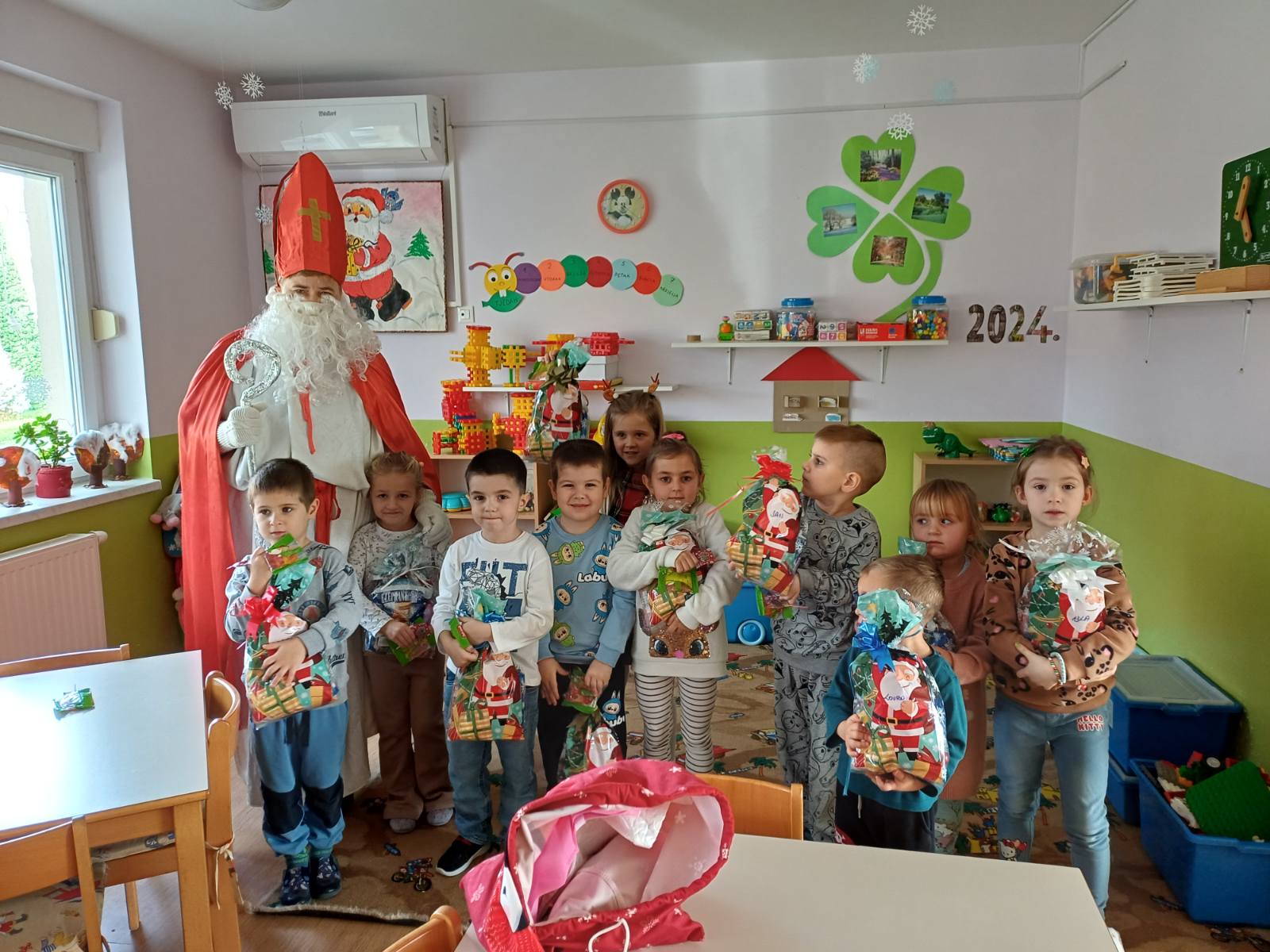 Naši mali vrtićanci otvorili su priredbu povodom Dana Svetog Nikole. Veselo su plesali i vrtili se u ritmu glazbe, što je izazvalo veliki pljesak publike. Nakon plesa, otpjevali su pjesmicu Svetom Nikoli, moleći ga da ih ne zaboravi jer su dobra dječica. Njihova izvedba bila je ispunjena radošću i veseljem, što je dodatno uljepšalo ovu posebnu priredbu.
